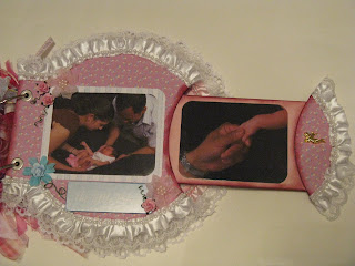 I used various papers from my stash and rounded the edges of the pics and the mats with my 1/2" corner chomper, blue lace around the edge, some flowers and some jeweled bling a button and the butterfly at the top is one of my own I made. I made a bow and added a pink mini paper rose at the center and attached it to the pullout.